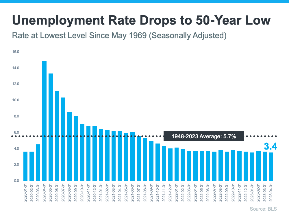 Ever since the Fed began fighting inflation, many people expected the low unemployment rate we’ve seen over the past couple of years to rise – but that hasn’t happened. In fact, what has happened is the unemployment rate has dropped to 3.4% – a 50-year low (see graph below):