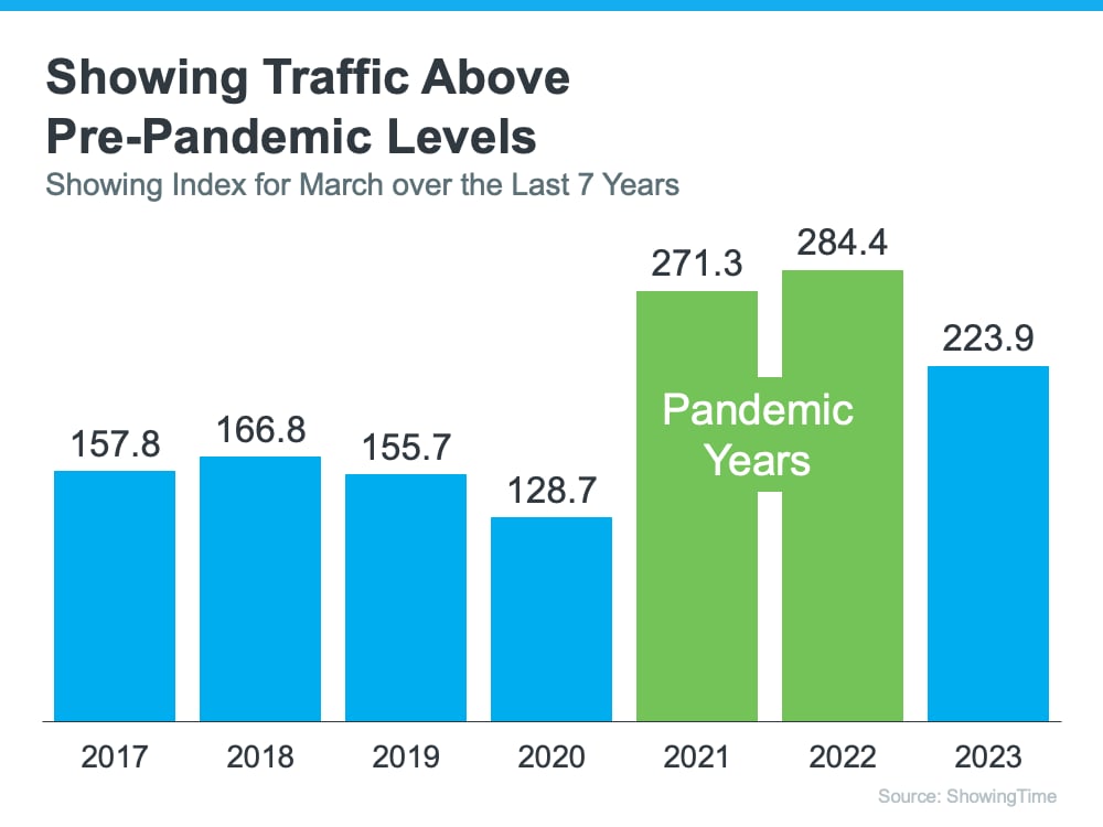 The spring housing market has been surprisingly active this year. Even with affordability challenges and a limited number of homes for sale, buyer demand is strong, and getting stronger. One way we know there are interested buyers right now is because showing traffic is up. Data from the latest ShowingTime Showing Index, which is a measure of buyers actively touring homes, makes it clear more people are out looking at homes than there were prior to the pandemic (see graph below):