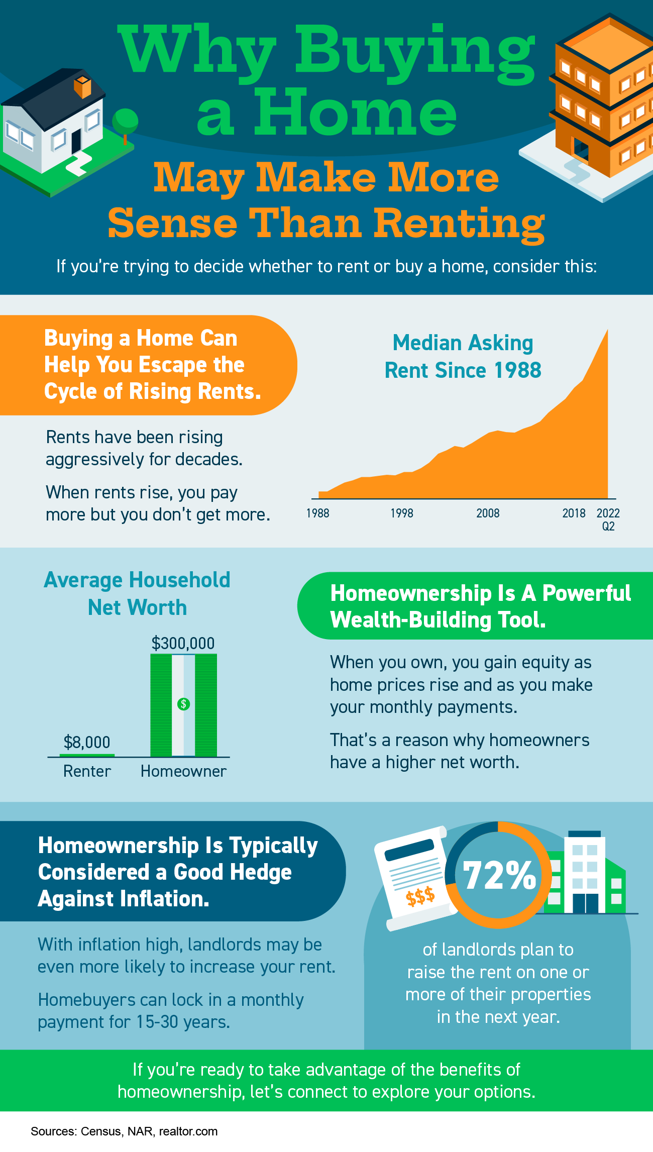 - Buying a home can help you escape the cycle of rising rents, it’s a powerful wealth-building tool, and it’s typically considered a good hedge against inflation.