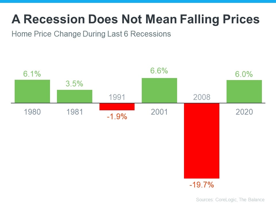 To show that home prices don’t fall every time there’s a recession, it helps to turn to historical data. As the graph below illustrates, looking at recessions going all the way back to 1980, home prices appreciated in four of the last six of them. So historically, when the economy slows down, it doesn’t mean home values will always fall.