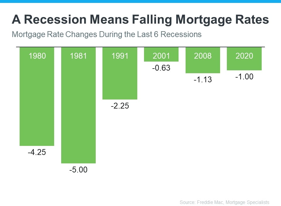 Research also helps paint the picture of how a recession could impact the cost of financing a home. As the graph below shows, historically, each time the economy slowed down, mortgage rates decreased.