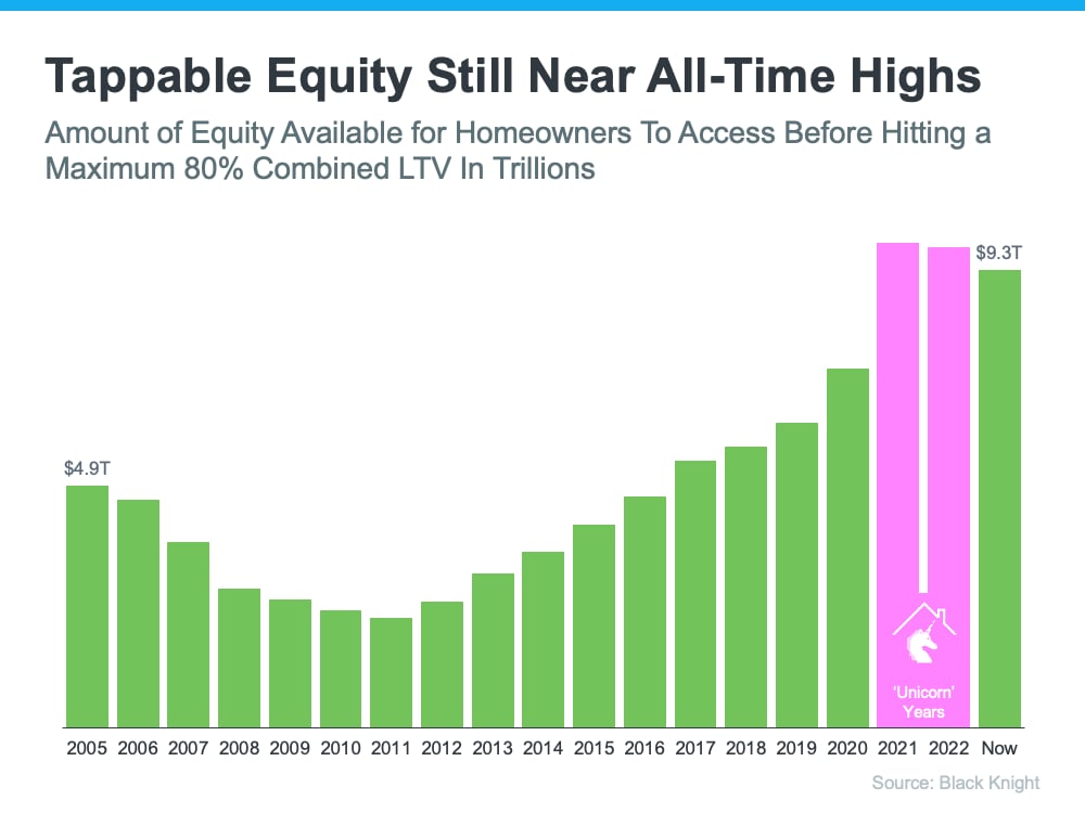 The graph below helps illustrate this point by looking at the total amount of tappable equity in this country going all the way back to 2005. Tappable equity is the amount of equity available for homeowners to access before hitting a maximum 80% loan-to-value ratio (LTV). As the data shows, there was a significant equity boost during the ‘unicorn’ years as home prices rapidly appreciated (see the pink in the graph below). But here’s what’s key to realize – even though there’s been a small dip, total homeowner equity is still much higher than it was before the ‘unicorn’ years.
