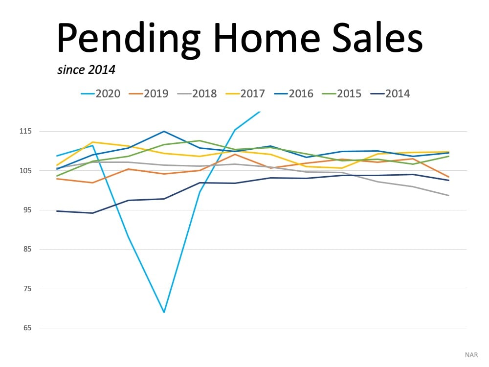 Below is a graph that shows the impressive recovery of homes sales compared to previous years. The deep blue v marks the slowdown from this spring that turned into an exponential jump in sales that followed through the summer, skyrocketing above years past:
