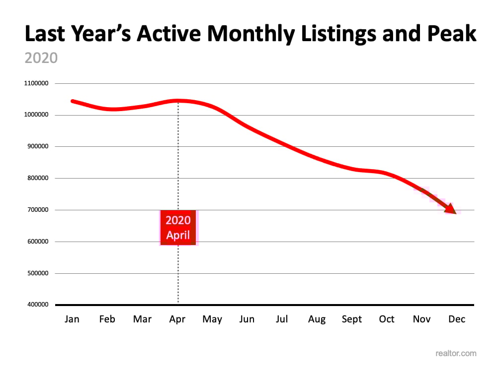 Last year, the trend was different. Historical seasonality wasn’t repeated in 2020 since many homeowners held off on putting their houses up for sale because of the pandemic (see graph below). In 2020, active listings peaked in April, and then fell off dramatically for the remainder of the year.