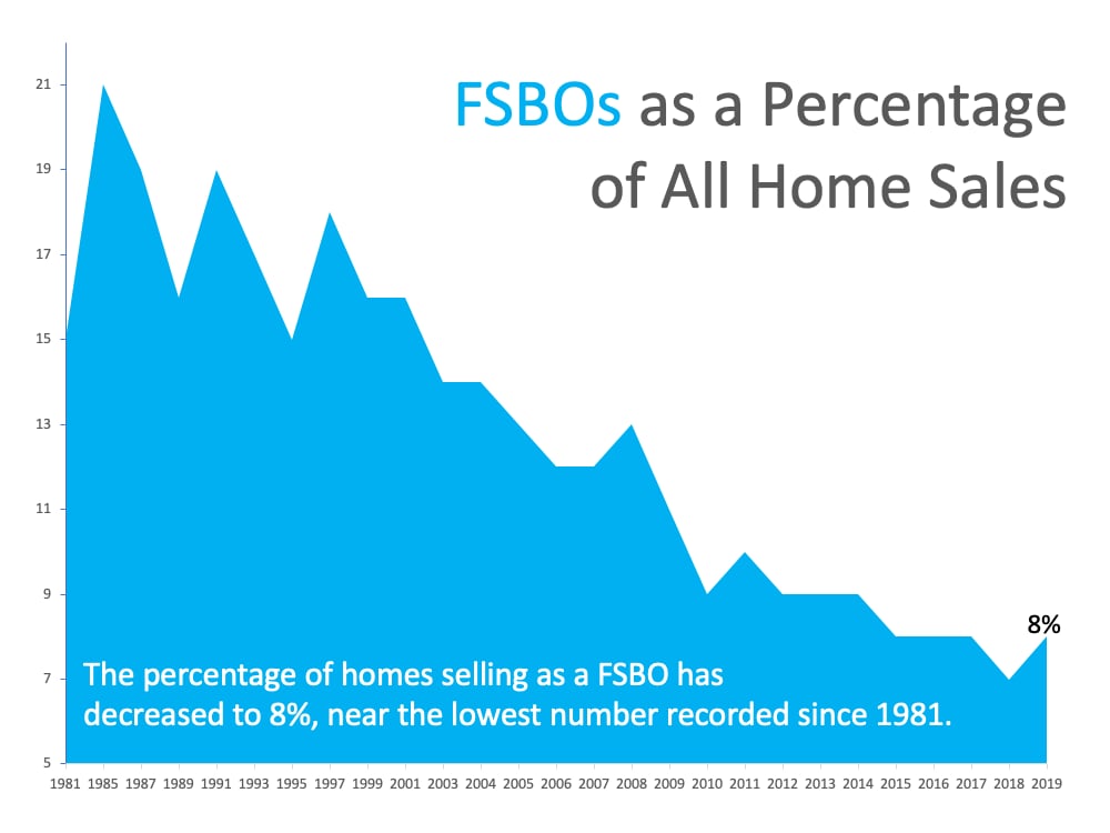 Selling a house is a time-consuming process – especially if you decide to do it on your own, known as a For Sale By Owner (FSBO). From conducting market research to reviewing legal documents, handling negotiations, and more, it’s an involved and highly detailed process that requires a lot of expertise to navigate effectively. That’s one of the reasons why the percentage of people selling their own house has declined from 19% to 8% (See graph below):