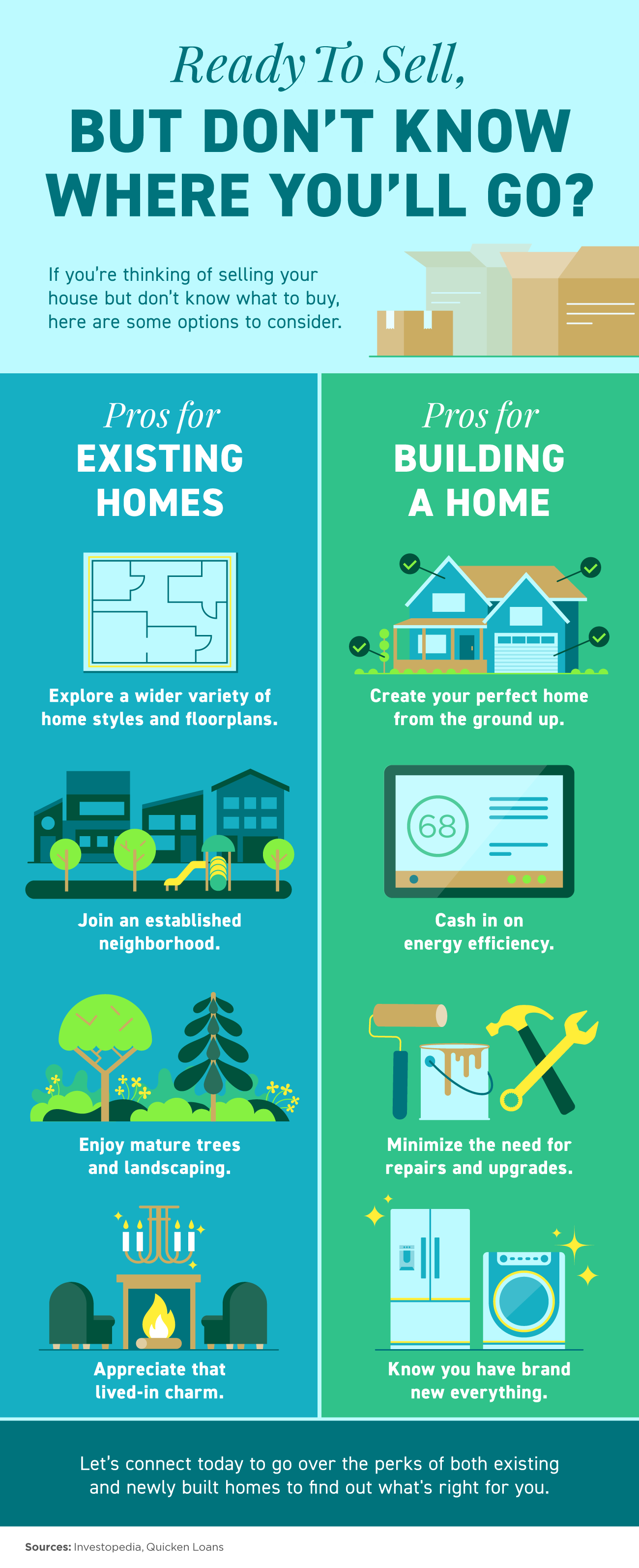 - Whether you’re looking for newly built or existing homes, both have their perks. If you’re ready to sell your house, let’s connect today to go over the perks of both existing and newly built homes to find out what’s right for you.