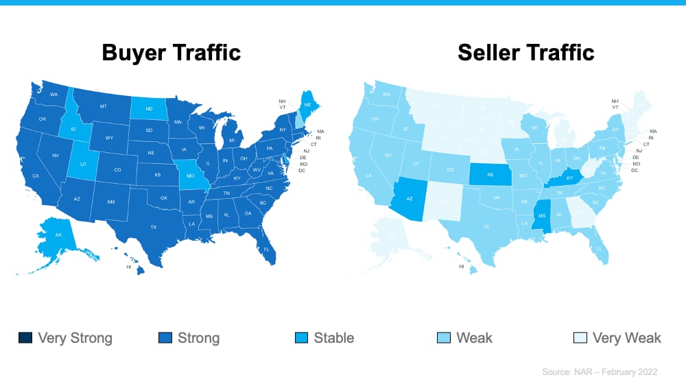 To help answer both of those questions, let’s turn to the data. Today, there are far more buyers looking for homes than sellers listing their houses. Here are the maps of the latest buyer and seller traffic from the National Association of Realtors (NAR) to help paint the picture of what this looks like: